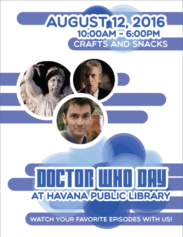 This Friday (8/12/16) is Doctor Who Day at the library! Come make crafts, eat snacks, and watch some episodes with us! We are going to be showing only the best episodes, so if you have a few favorites be sure to leave a comment on facebook and suggest which episodes you want to see!